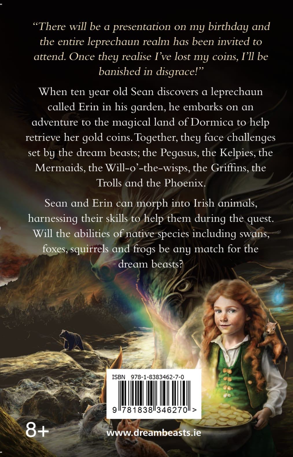 When ten year old Sean discovers a leprechaun called Erin in his garden, he embarks on an adventure to the magical land of Dormica to help retrieve her gold coins. Together, they face challenges set by the dream beasts; the Pegasus, the Kelpies, the Mermaids, the Will-o’-the-wisps, the Griffins, the Trolls and the Phoenix.